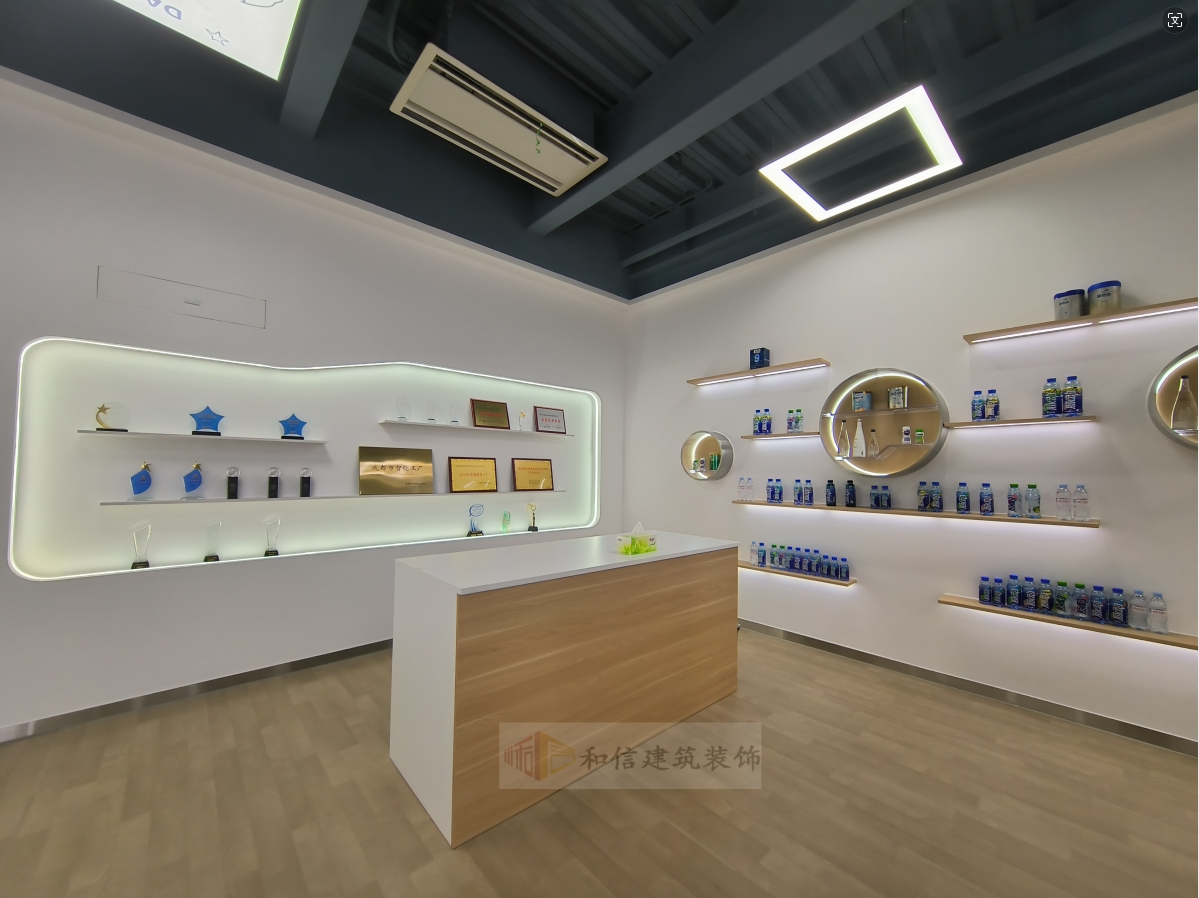 展廳的室內空間圍繞白色的墻壁和天花板以及木質地板為設計主題。左側有一個帶有白色背景和藍色文字的展柜,上面擺放著一些產品用來展示。展柜下方是一個木質柜臺,右側是一排貨架,上面同樣陳列擺放著更多的展示產品。墻上掛著圓形裝飾畫,融合了產品的意境,整個場景給人一種簡潔、現(xiàn)代的感覺。