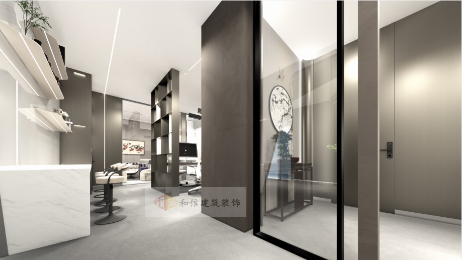 前廳承載著公司的企業(yè)文化,所以在設(shè)計上堪稱匠心獨運,一面大型的白色鋁板背景板宛如一幅未完的畫布,其上點綴著圓孔圖案,猶如水墨般流淌著現(xiàn)代藝術(shù)的韻味。在這塊背景板的中央,醒目地矗立著大寫的公司logo“和信裝飾,字體雄渾有力,彰顯著公司的穩(wěn)重與實力。背景板的色調(diào)與周遭的白色環(huán)境完美融合,形成了一種和諧統(tǒng)一的視覺效果。